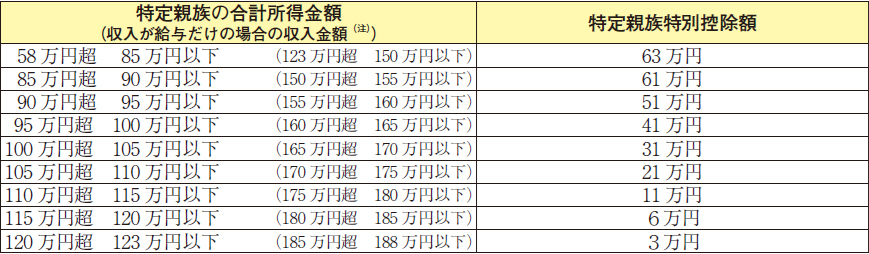 特定親族とは、所得者と生計を一にする年齢 19 歳以上 23 歳未満の親族(配偶者、青色事業専従者として給与の支払を受ける人及び白色事業専従者を除きます。)で合計所得金額が 58 万円超 123万円以下の人をいいます。(適用を受けようとする人は、「給与所得者の特定親族特別控除申告書」を提出する必要があります。)
