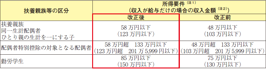また、上記の基礎控除の改正に伴い扶養親族等の所得要件が改正されました。